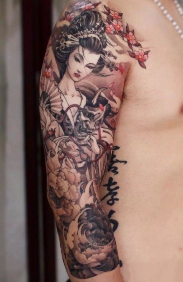日本艺妓纹身图 黑灰或彩绘的日本艺妓包臂纹身图案