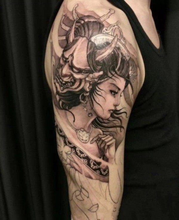 日本艺妓纹身图 黑灰或彩绘的日本艺妓包臂纹身图案