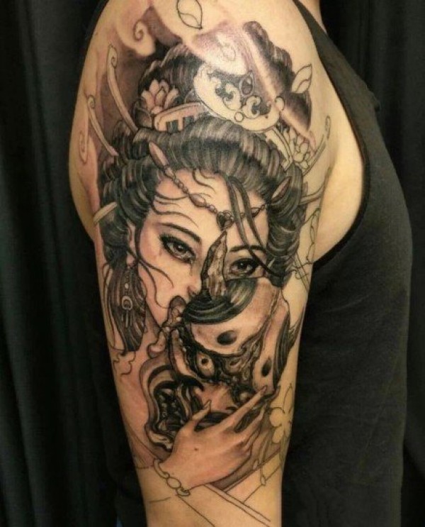 日本艺妓纹身图 黑灰或彩绘的日本艺妓包臂纹身图案