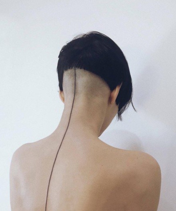女生后腰纹身黑白灰风格抽象线条纹身图案