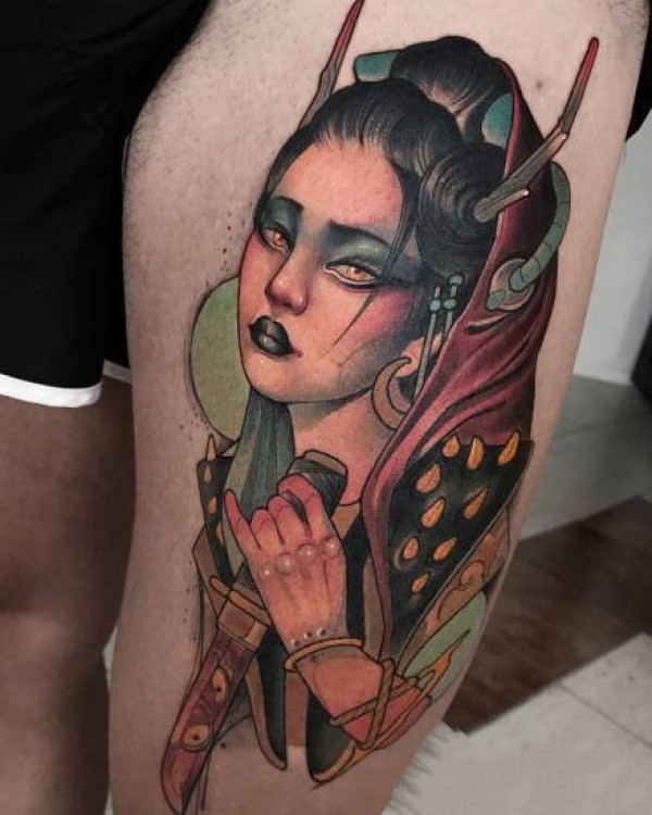 帅气的彩色花腿纹身水墨画纹身图案