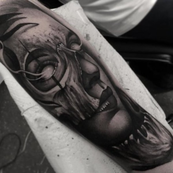 欧美黑灰小图人物骷髅眼睛写实肖像纹身
