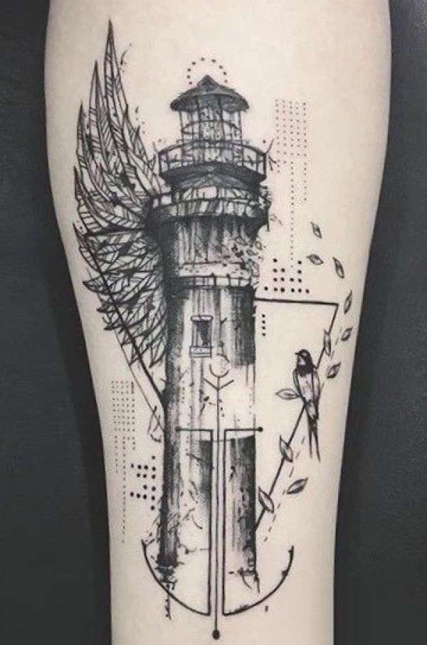 大臂纹身图 男生大臂上齿轮和灯塔纹身图片