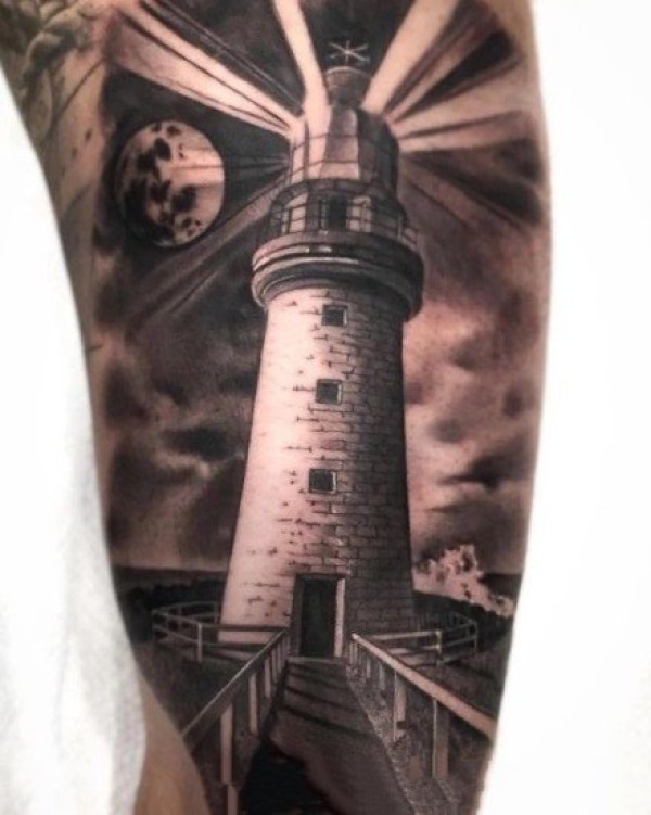 大臂纹身图 男生大臂上齿轮和灯塔纹身图片