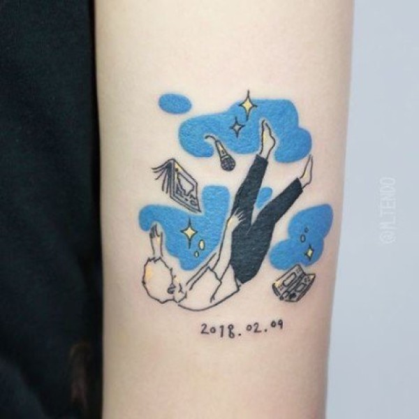 手臂臂环纹身和赤裸天使,蓝色羽翼