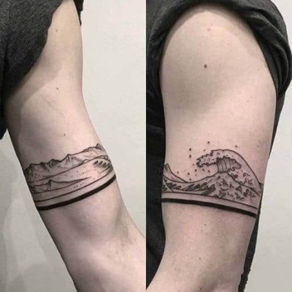 适合情侣的手腕点刺山脉海浪纹身图案