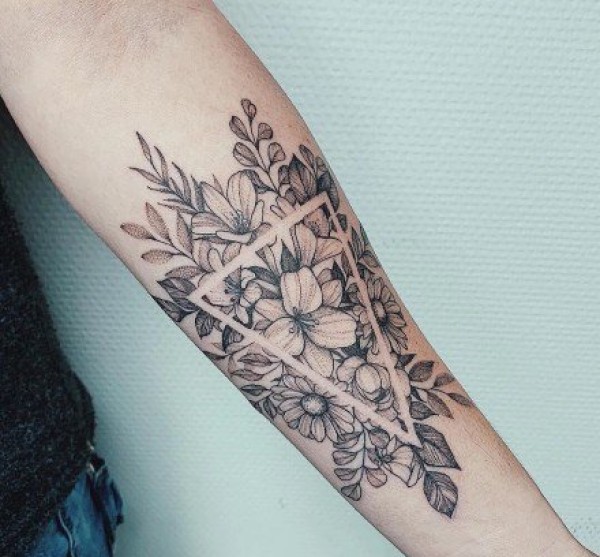 大臂素花纹身 9款女士的大臂黑灰花朵植物纹身图案