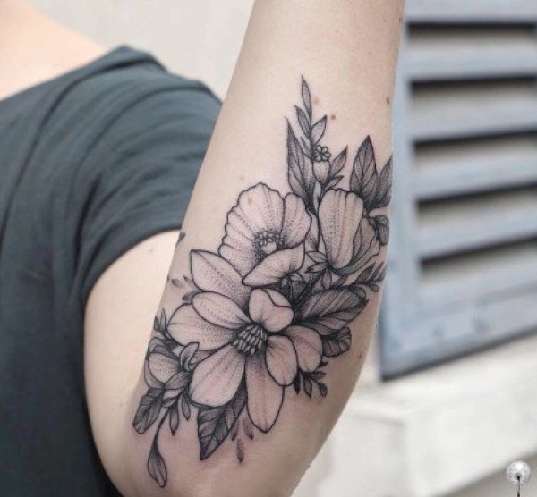 大臂素花纹身 9款女士的大臂黑灰花朵植物纹身图案