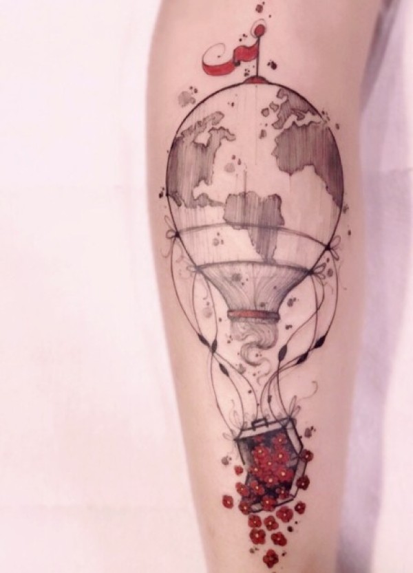 热气球纹身图案身 女生大腿上彩色的热气球纹身图片