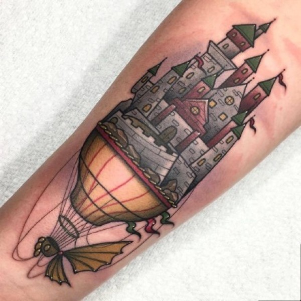 手臂纹身图片 男生手臂上人物和热气球纹身图片
