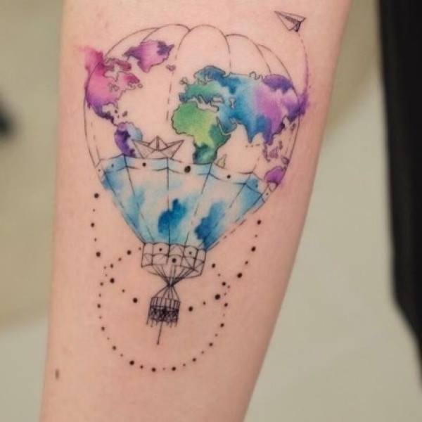 手臂纹身图片 男生手臂上人物和热气球纹身图片
