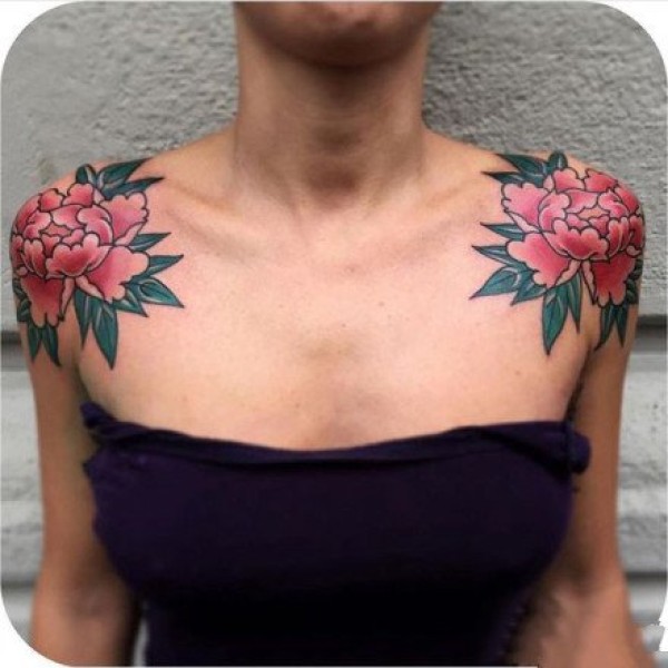 女性双肩部的对称肩花纹身作品
