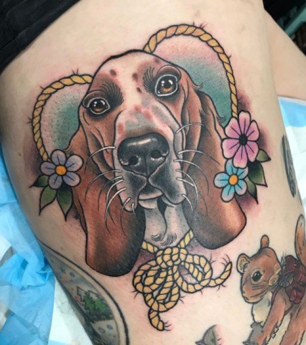 大腿上的国外欧美彩色new school 花腿纹身