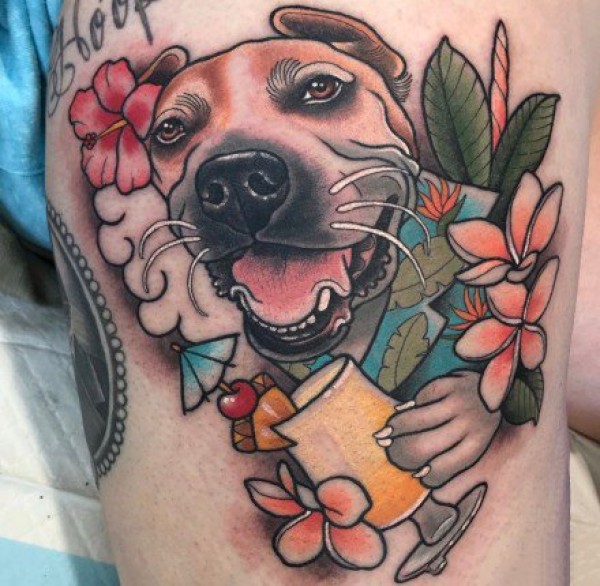 大腿上的国外欧美彩色new school 花腿纹身