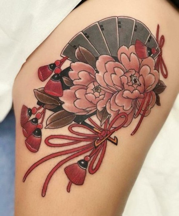 包小腿彩色经典传统艺妓莲花扇子纹身图案