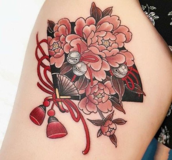 包小腿彩色经典传统艺妓莲花扇子纹身图案