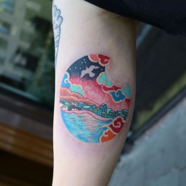 圆形风景纹身 小臂上的一组圆图形里的小风景纹身图案