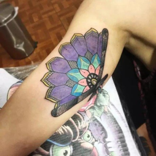 双大臂纹身 女生大臂上杯子和扇子纹身图片