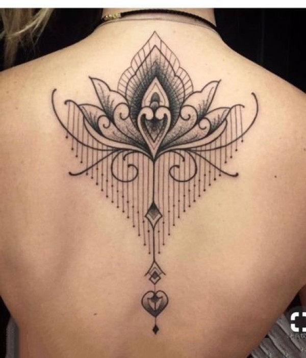 纹身后背女 女生脊柱上梵文和莲花纹身图片