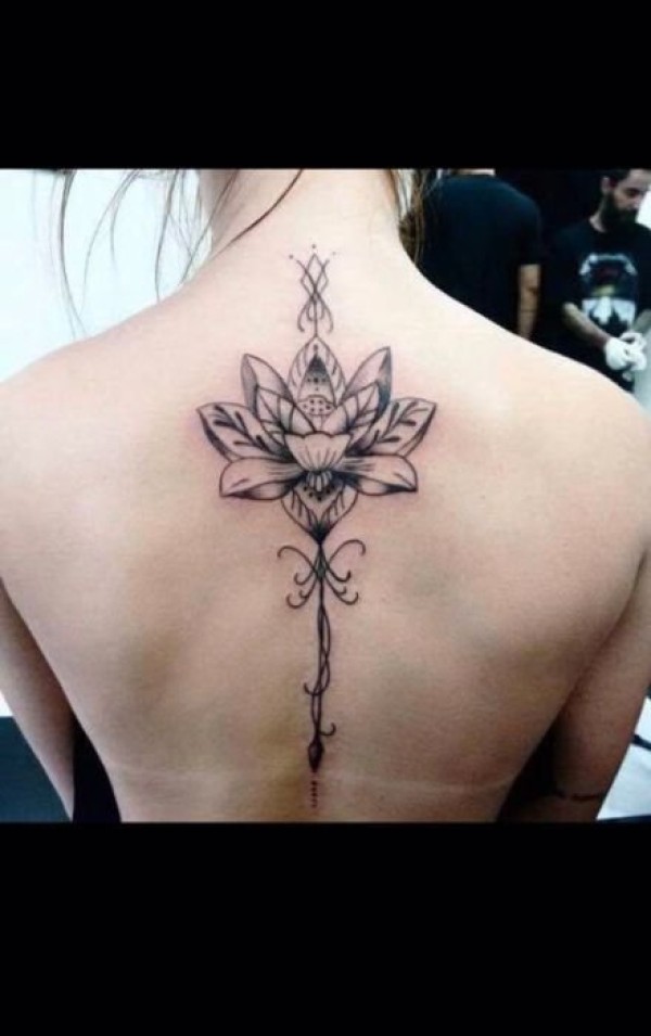 纹身后背女 女生脊柱上梵文和莲花纹身图片