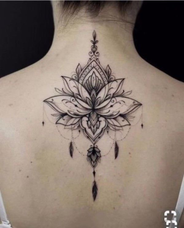纹身后背女 女生脊柱上梵文和莲花纹身图片