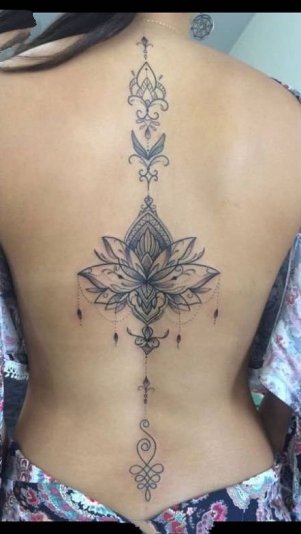 纹身后背女 女生脊柱上梵文和莲花纹身图片