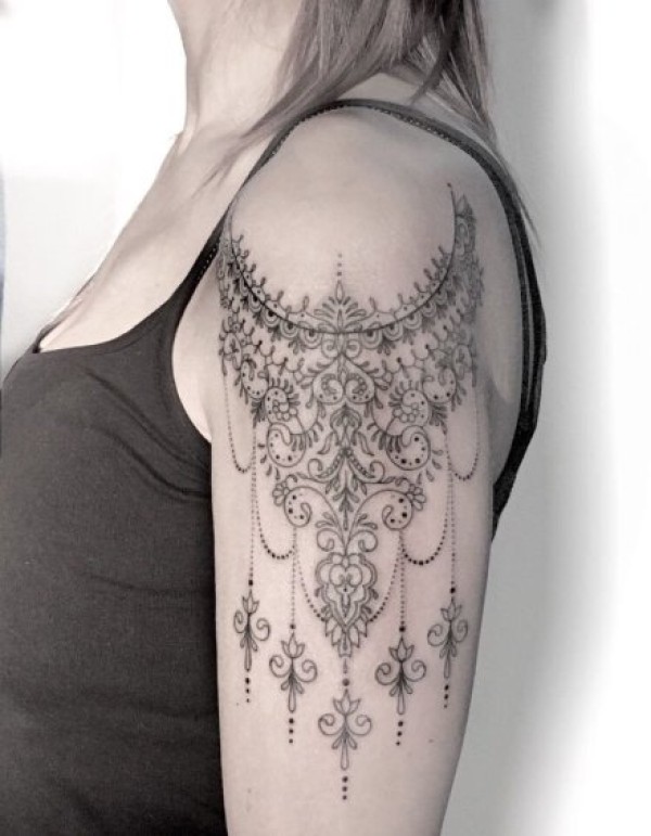 女生肩部好看的蕾丝链纹身图案