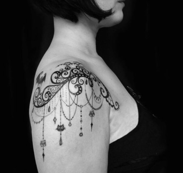 女生身上很性感的宝石蕾丝链纹身图案欣赏