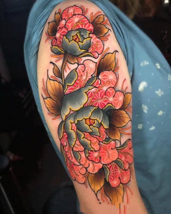 日式老传统牡丹花臂纹身作品图案9张