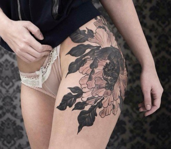 纹身小牡丹 黑色调却不失华贵的牡丹纹身图案