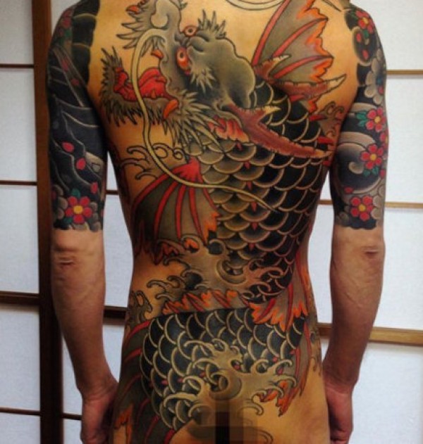 满背凤凰和鲤鱼纹身图案