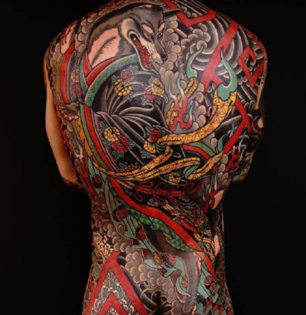 新传统风格的9张男性黑灰大满背纹身图案图片