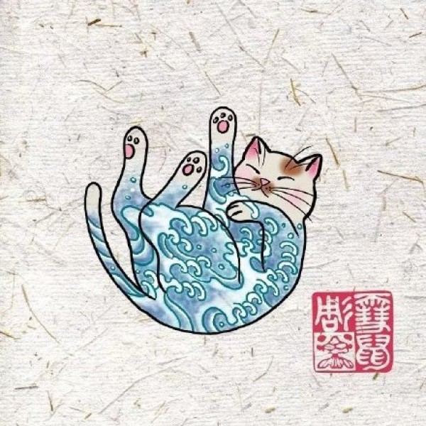 不一样的日本浮世绘蓝色小猫咪纹身图片