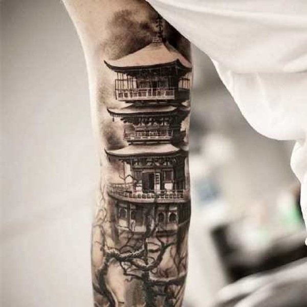 9张和风亭子古塔建筑的纹身图案作品