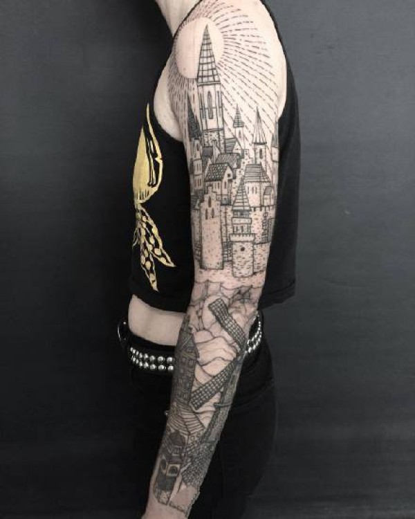 欧美大黑灰风格的城堡建筑系纹身作品