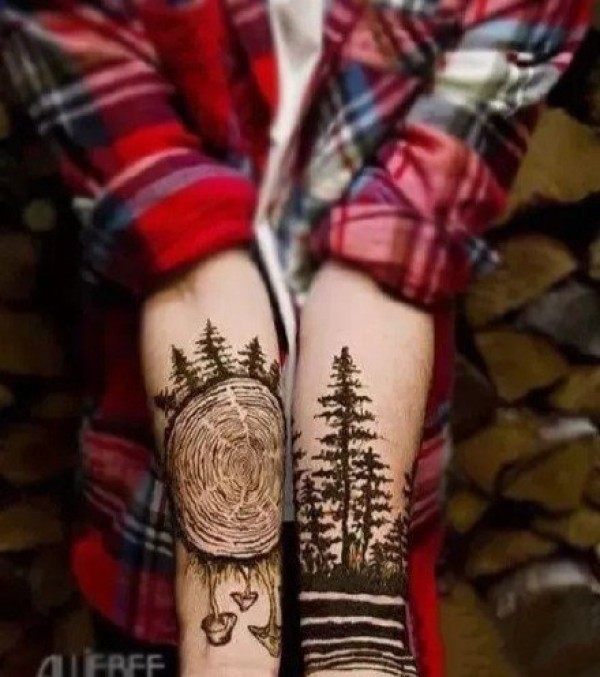 森林树木纹身图案_一组手臂上黑灰树木森林纹身图案作品