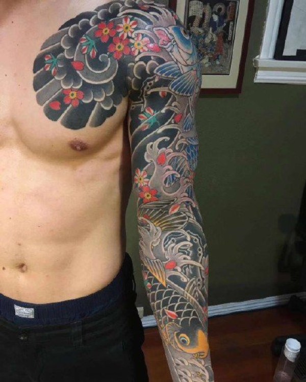 来自中国经典的传统半甲喜庆鲤鱼牡丹纹身手稿_半甲纹身图案大全_纹身图吧