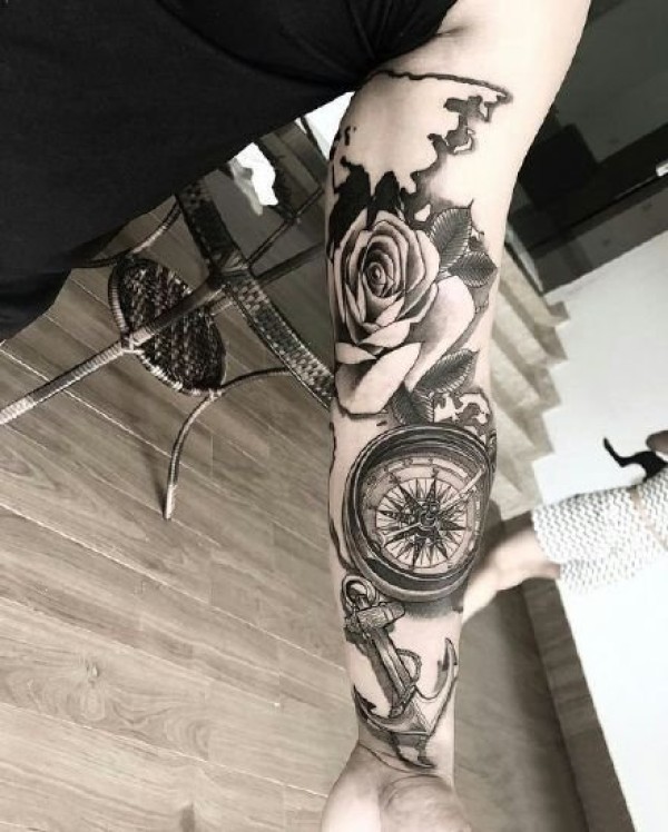 黑臂时钟纹身--一组男士小手臂上的黑臂时钟指南针纹身图案