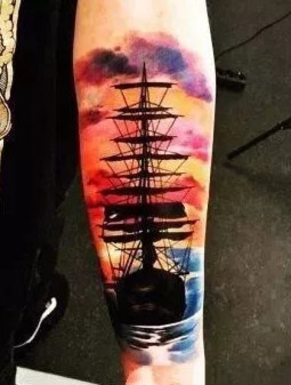 大臂纹身图 男生大臂上阴森的海盗船纹身图片