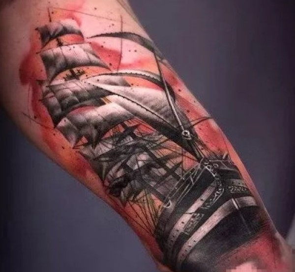 大臂纹身图 男生大臂上阴森的海盗船纹身图片