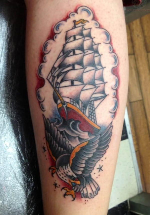 大臂纹身图 男生大臂上阴森的海盗船纹身图片