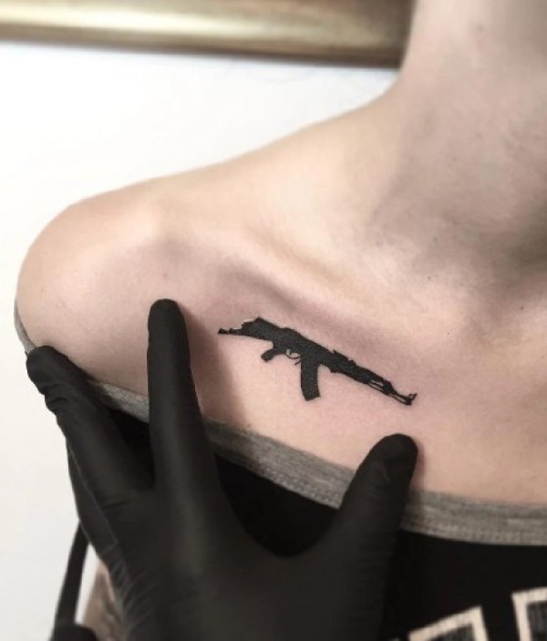 胸部上威力无穷的手枪纹身图图片