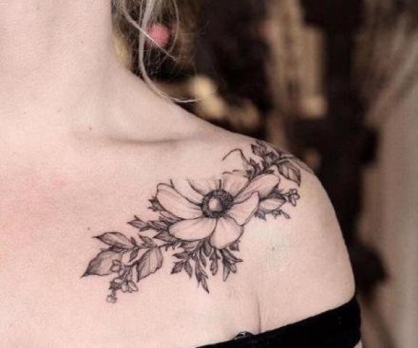 女生肩部的黑灰素花纹身作品图