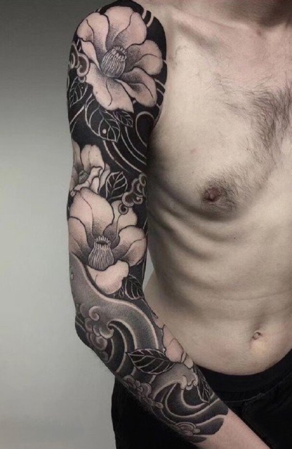 欧美花臂纹身_22张霸气黑灰欧美大黑花臂纹身图案作品图片