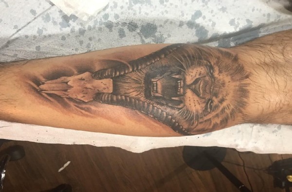 狮子头纹身图片 男生小手臂上黑灰纹身动物狮子头纹身图片