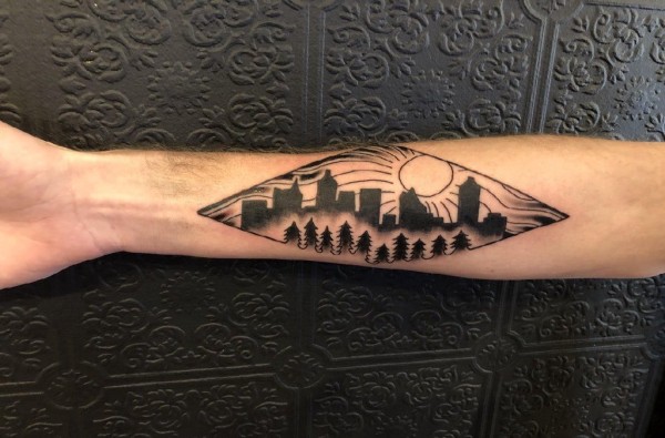 男生小手臂上黑灰纹身松树图案和建筑物图