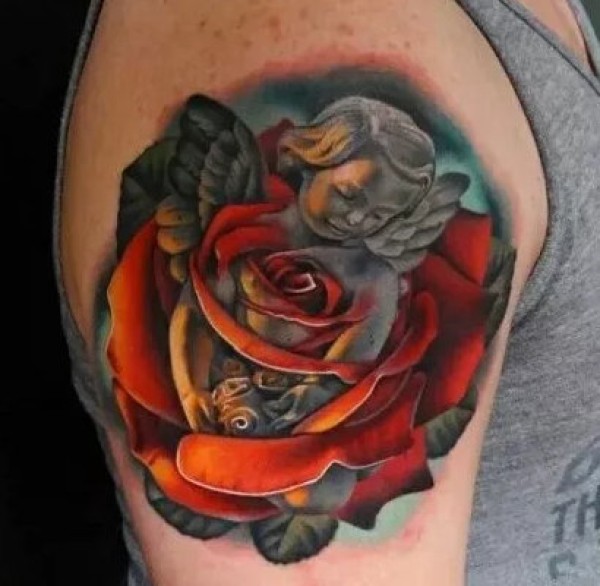 很酷精美的一款爱心翅膀玫瑰纹身图案_玫瑰花纹身图案大全_纹身图吧