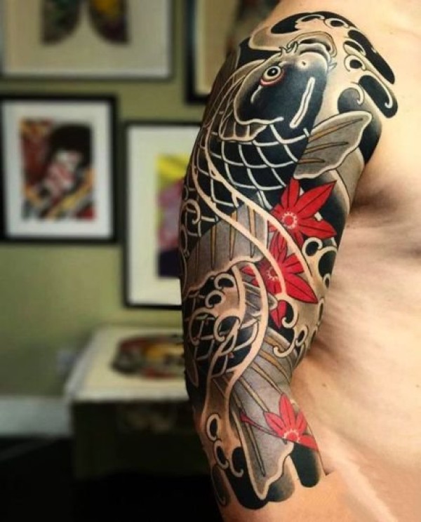 蝙蝠,幼狮,鲤鱼组成的花臂纹身