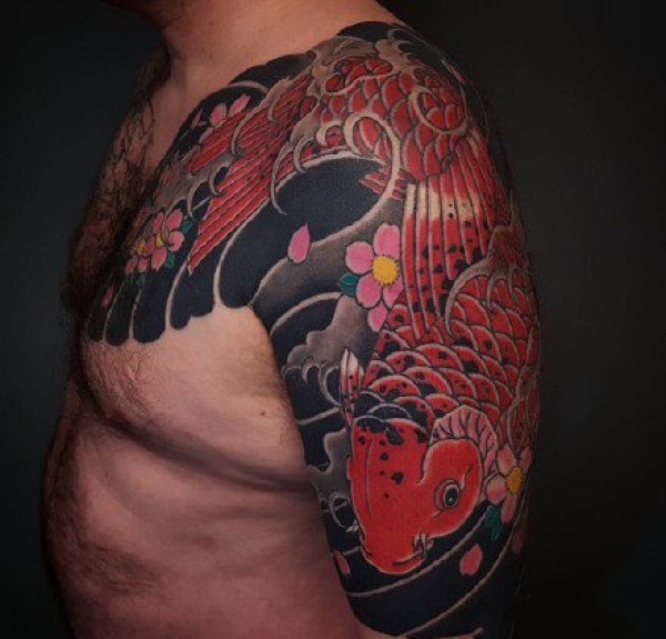 来自中国经典的传统半甲喜庆鲤鱼牡丹纹身手稿_半甲纹身图案大全_纹身图吧