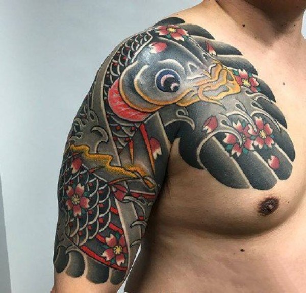来自中国经典的传统半甲喜庆鲤鱼牡丹纹身手稿_半甲纹身图案大全_纹身图吧